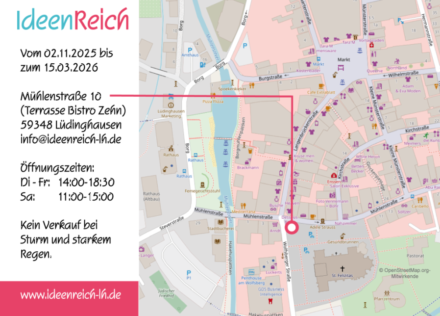 Seit 2024 leben mein Mann und ich in Lüdinghausen. Wir lieben diese Stadt. Meinen Marktstand mit den Produkten der kreativen Talente finden Sie auf folgenden Märkten bzw. an folgenden Verkaufsstandorten: